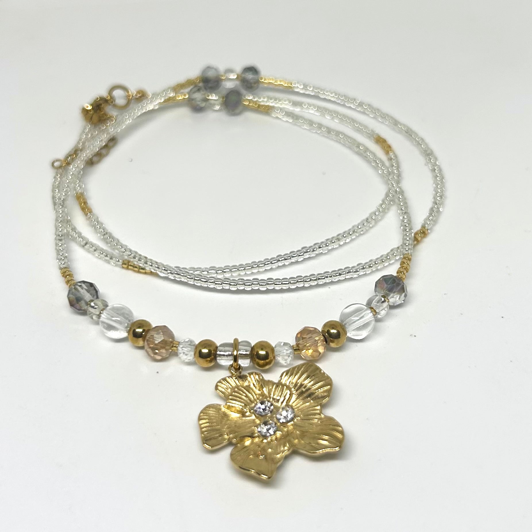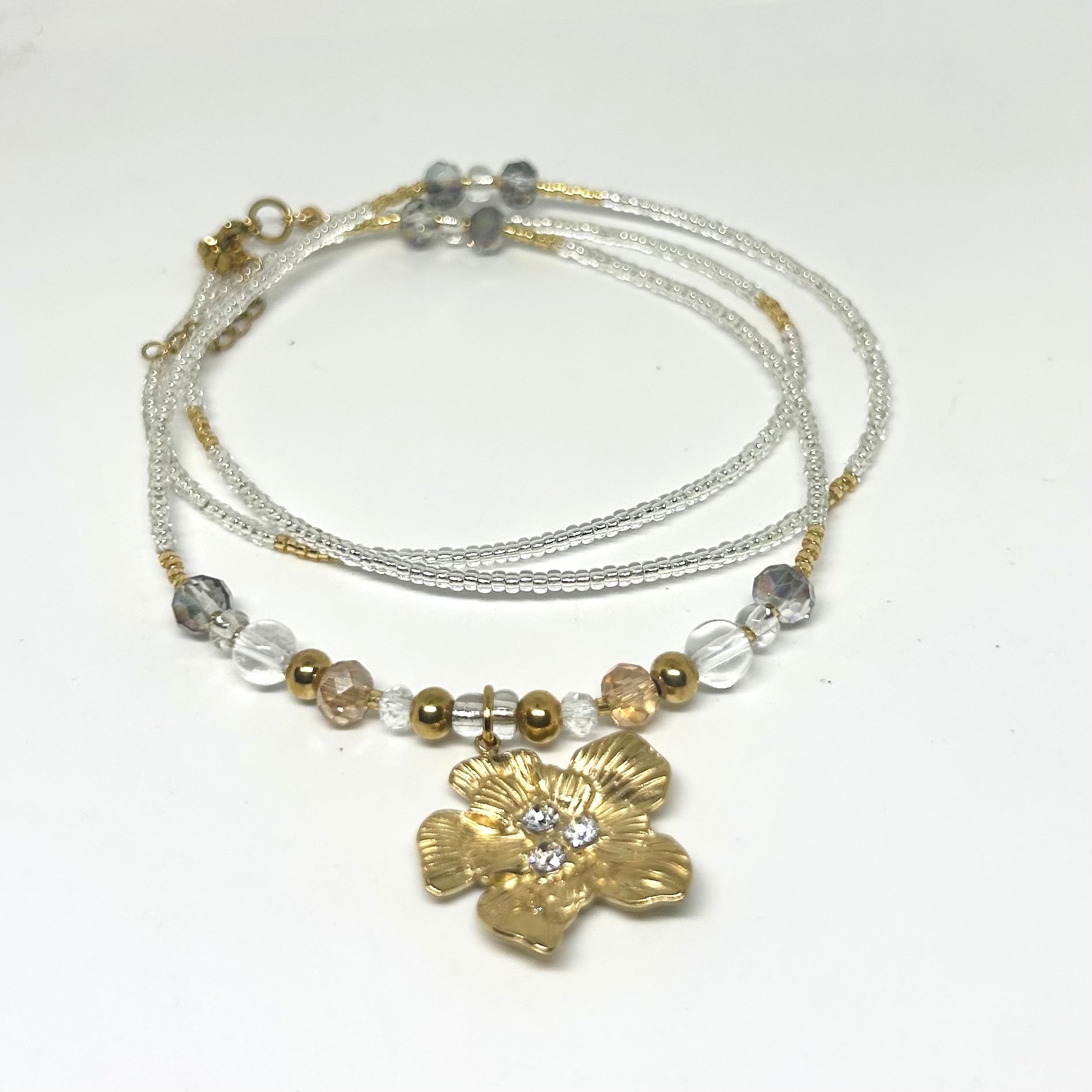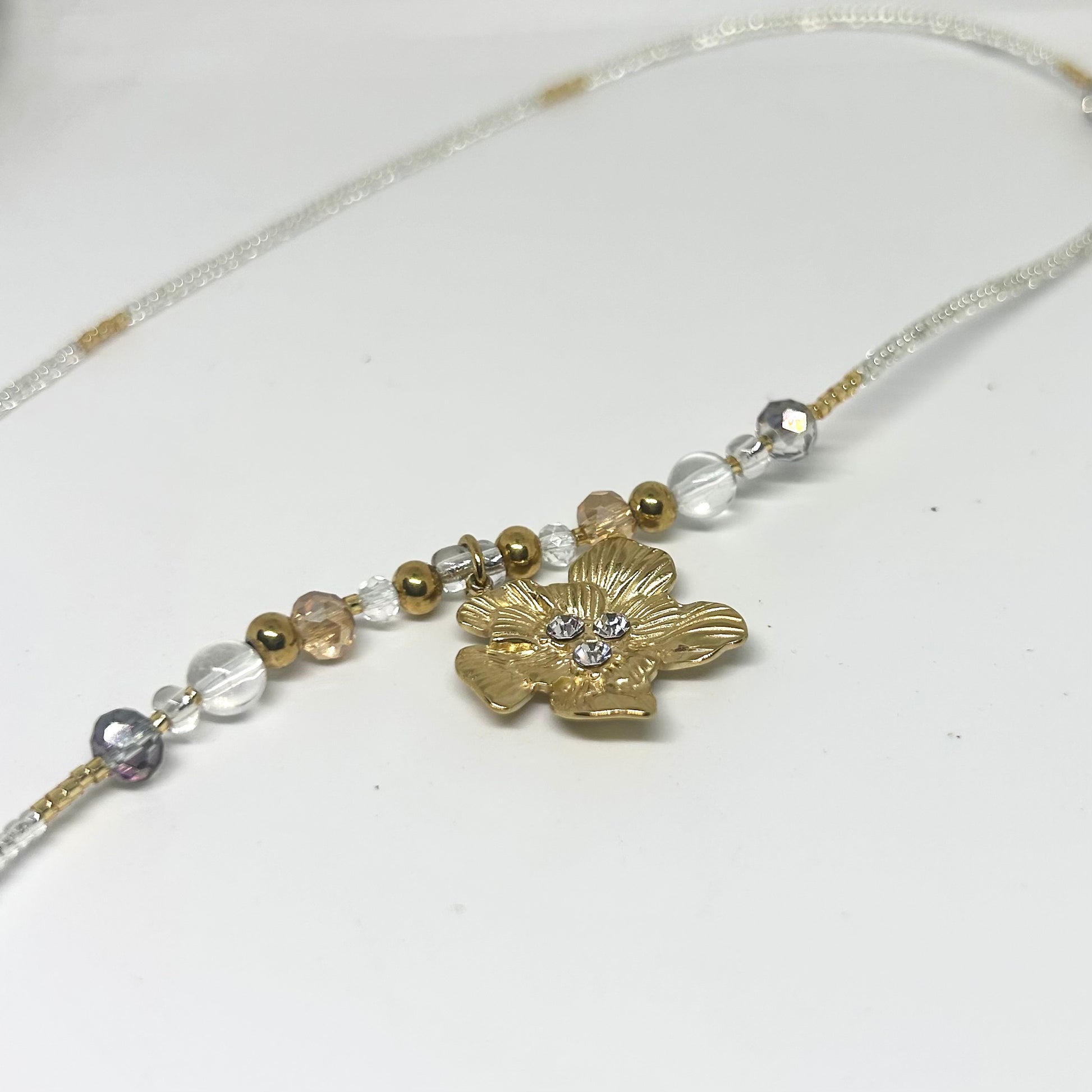 Flora Éclat est une chaîne de taille en perles de rocailles. Elle comporte des pierres naturelles de cristal de roche et d’un pendentif en acier inoxydable.