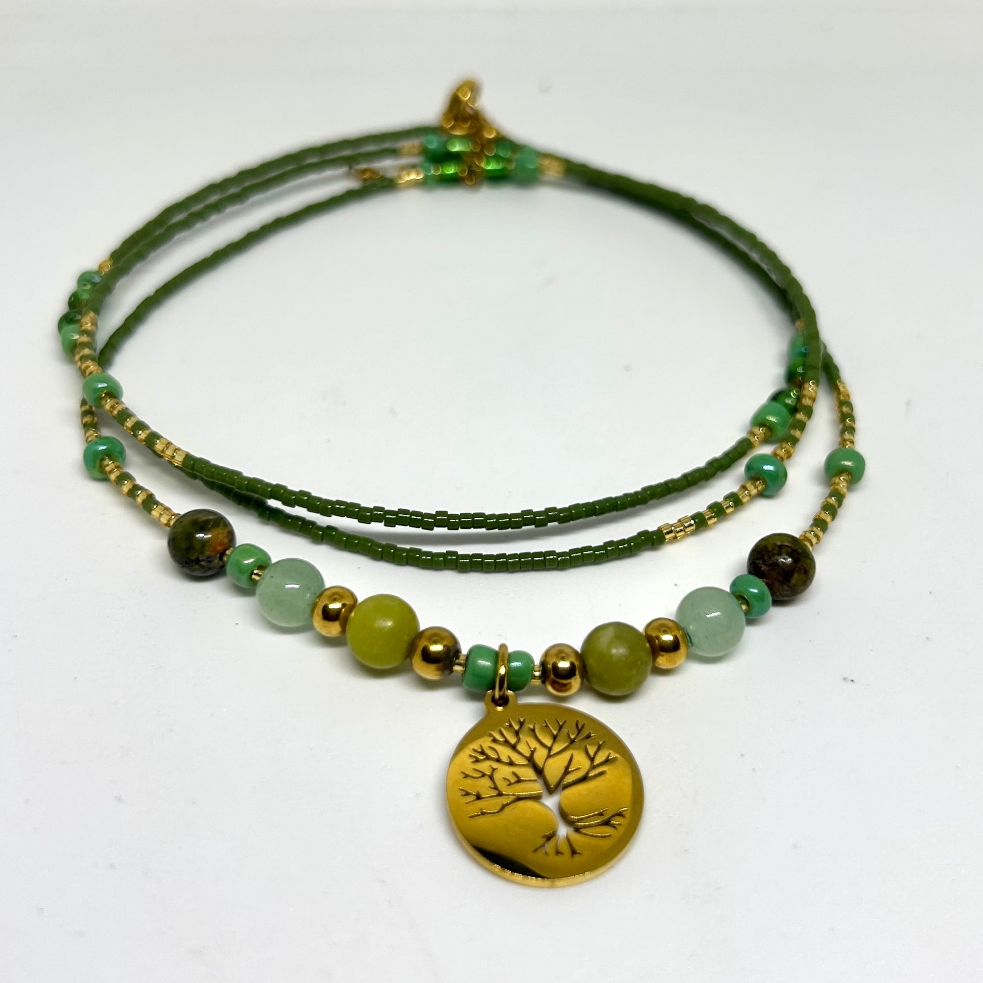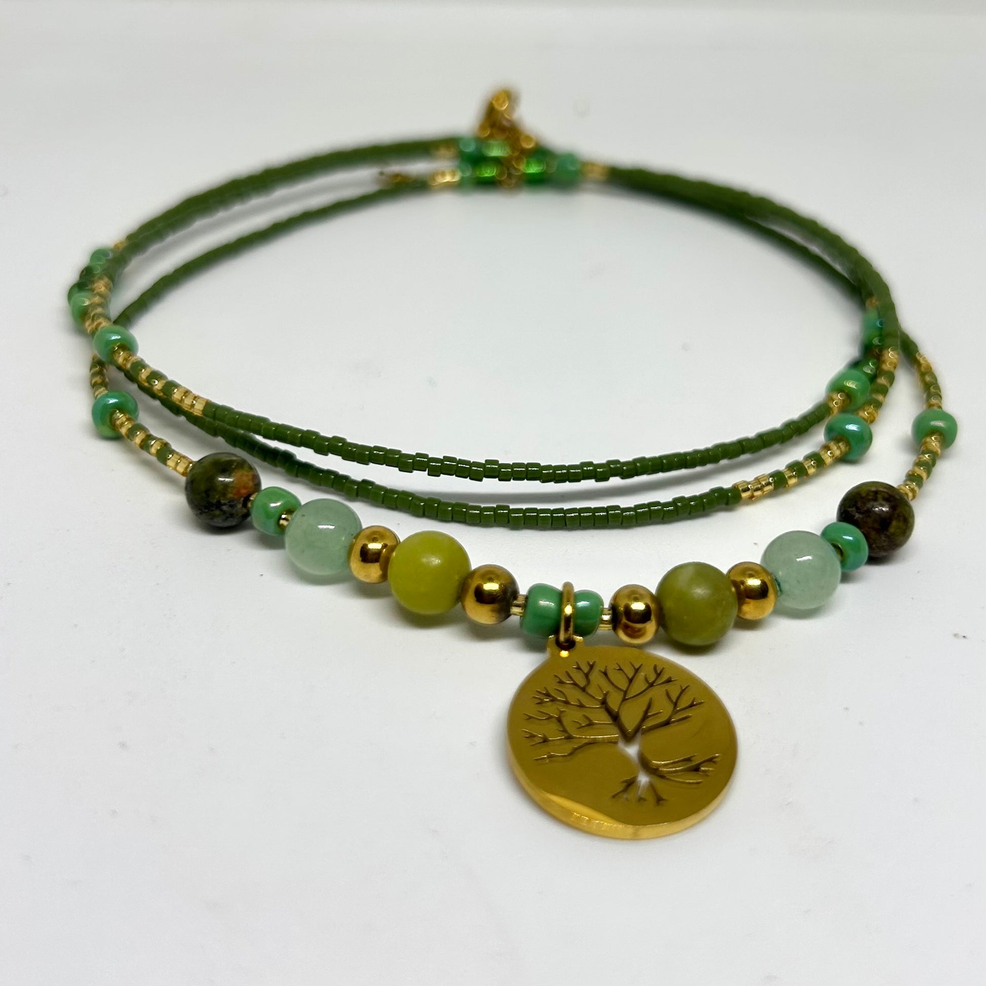Arbre de vie est une chaîne de taille en perles de rocailles avec des pierres naturelles d’aventurine verte, de péridot et de serpentine verte et un pendentif en acier inoxydable.