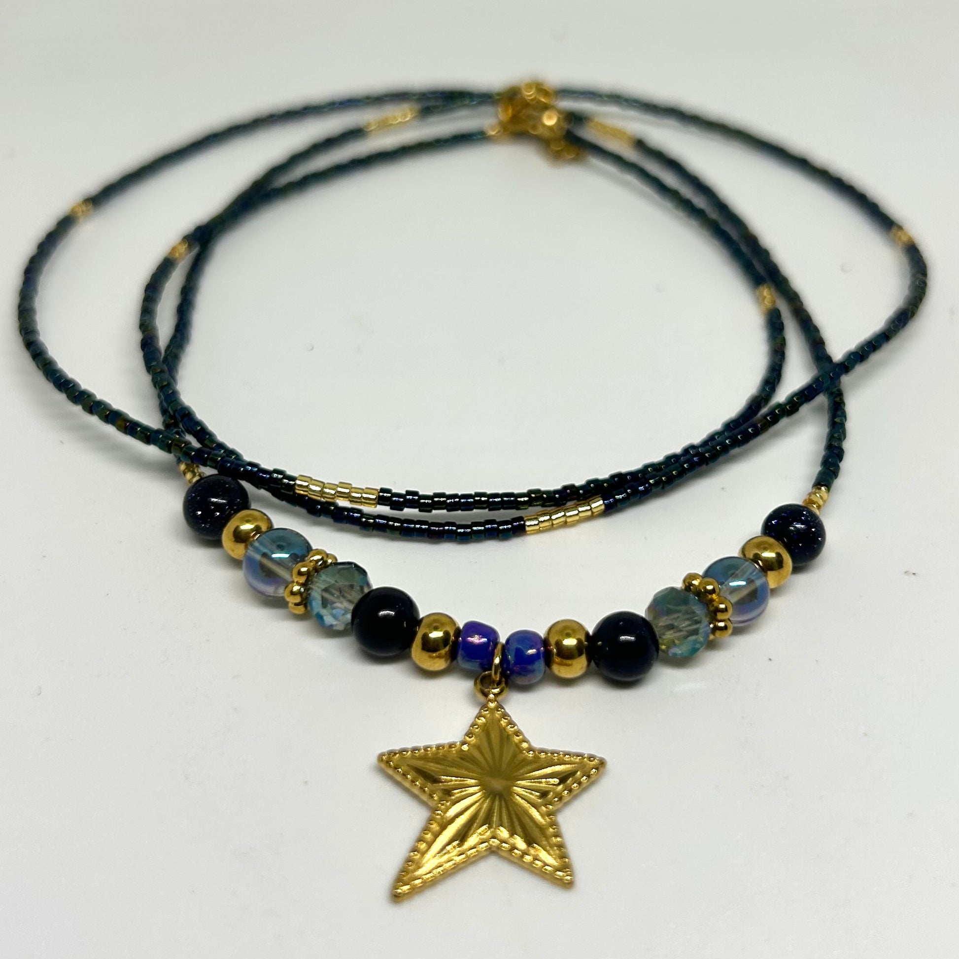 Lumina est une chaîne de taille en perles de rocailles. Elle comporte des pierres naturelles de Aqua aura et de golden stone bleu ainsi qu’un pendentif en acier inoxydable.
