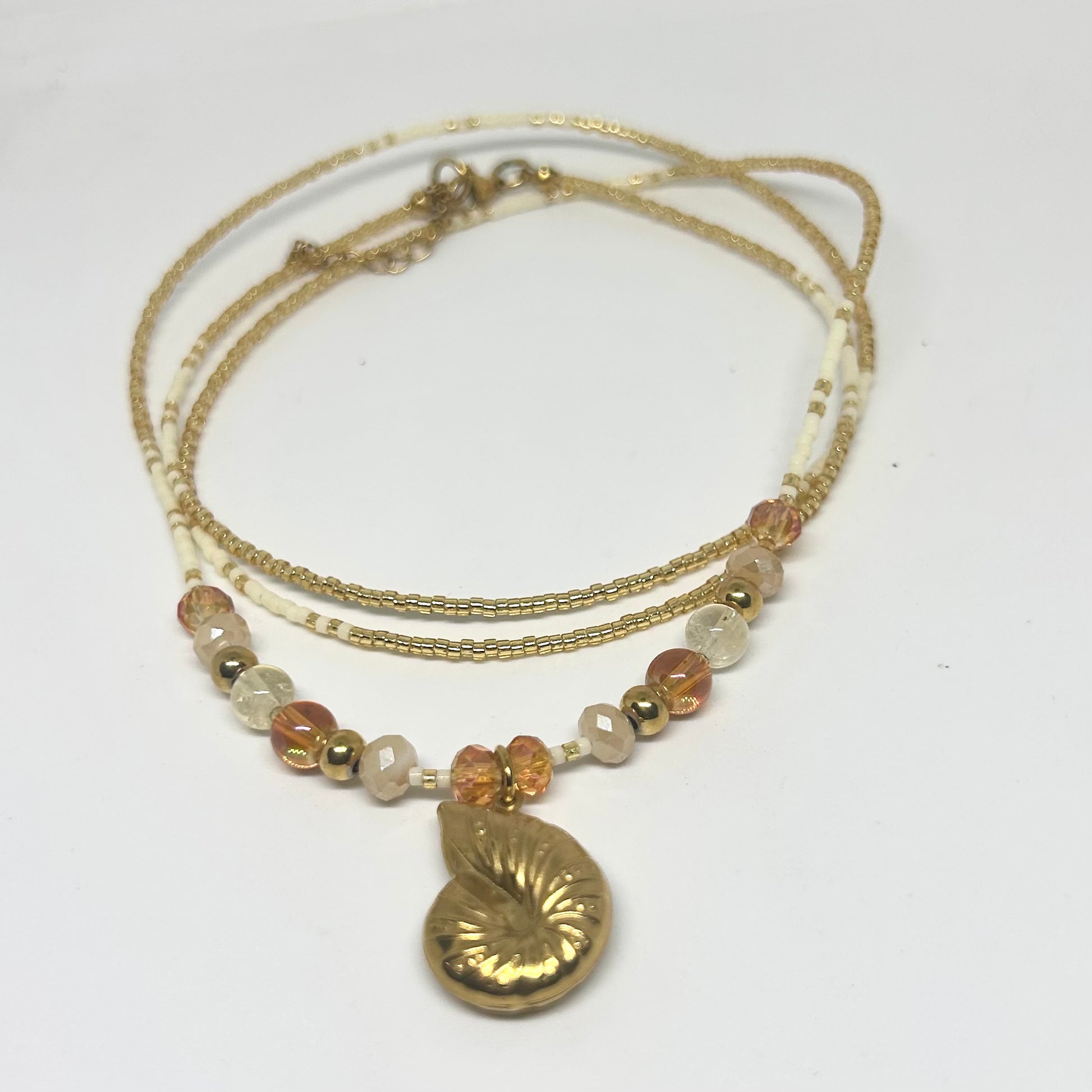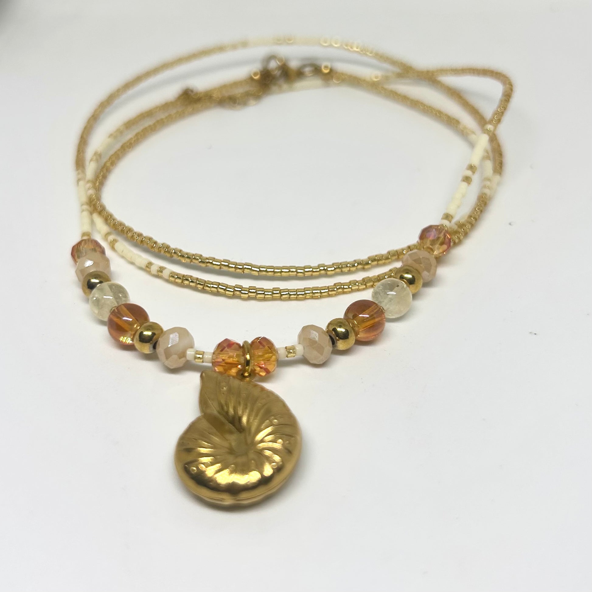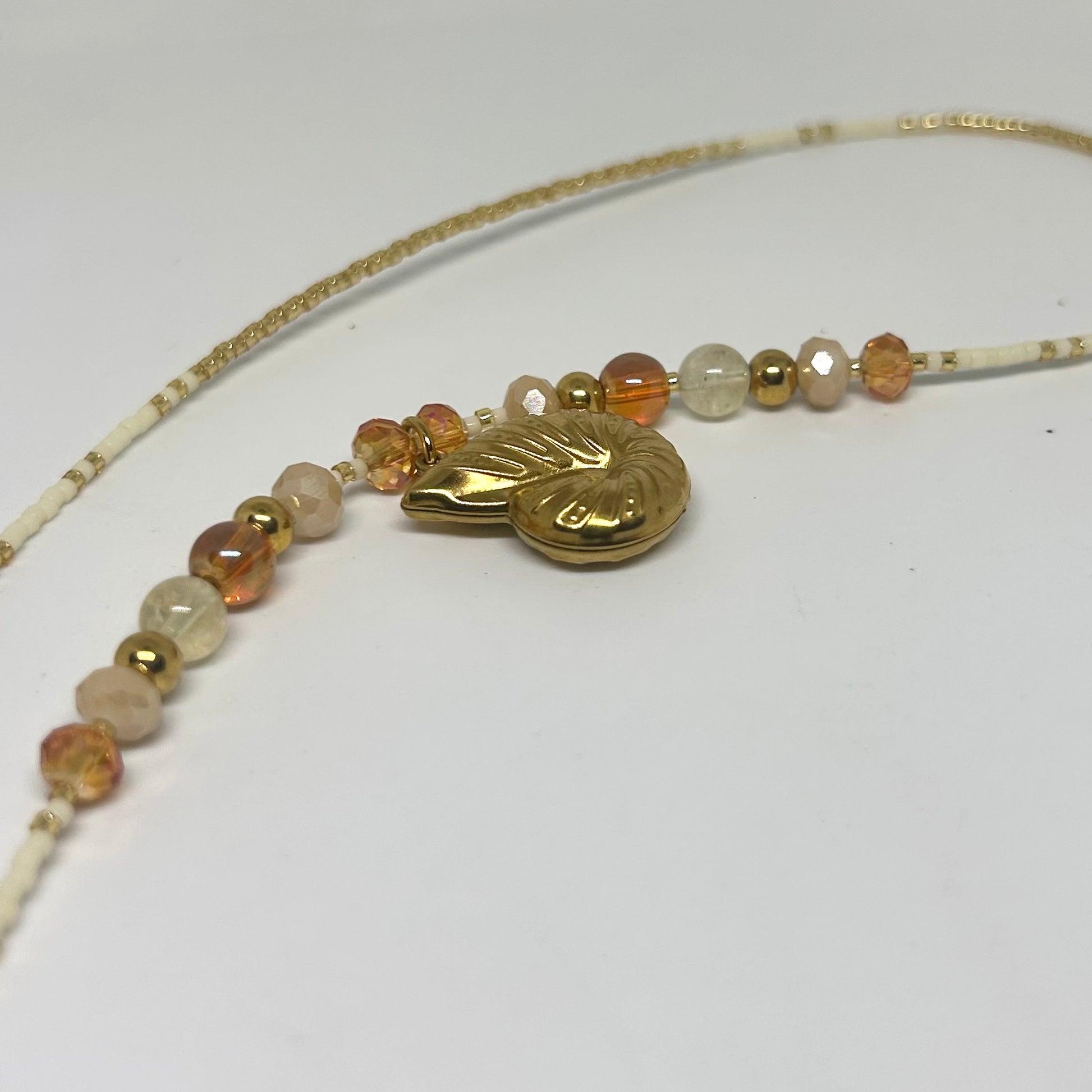 Harmonia est une chaîne de taille en perles de rocailles. Elle comporte des pierres naturelles de citrine, de quartz aura et un pendentif en acier inoxydable.
